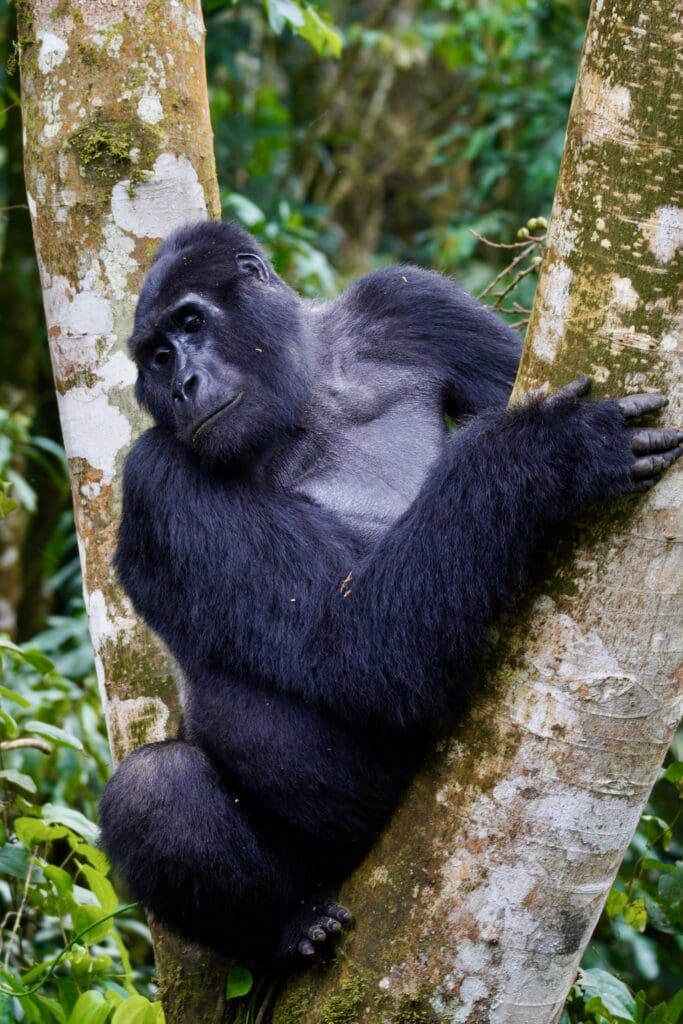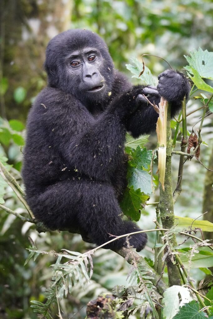 De volgende ochtend ging de wekker vroeg. Dit was hét moment: we gingen de berggorilla’s van Bwindi ontmoeten! Bwindi Impenetrable Forest is wereldberoemd vanwege zijn gorillapopulatie, en wij hoopten vandaag oog in oog met ze te staan. Bij het hoofdkantoor moesten we ons registreren en onze vergunningen laten zien. Terwijl we wachtten, werden we verwelkomd door een groep lokale vrouwen en meisjes die voor ons zongen en dansten. Zoveel emotie en expressie stoppen zij erin, het was echt ontroerend mooi! Daarna werd onze trekkinggroep samengesteld. Wij werden ingedeeld bij een groep waarin twee oudere dames en een diva-achtig meisje met een handtas zaten. Dat betekende dat we een gorillagroep zouden bezoeken die relatief dicht bij de rand van het park leefde. Aan de ene kant jammer, omdat we minder diep het woud in gingen, maar aan de andere kant zagen we misschien wel de ‘African helicopter’ (de nood-helikopter) in actie als iemand gered moest worden. Het werd al snel duidelijk dat dit inderdaad een pittige tocht zou worden voor sommige groepsgenoten. Eén van de dames had een porter ingehuurd om haar tas te dragen en haar te ondersteunen, maar was nog voordat we het bos bereikten al compleet uitgeput. De gids adviseerde haar om terug te gaan, maar ze weigerde op te geven. De andere dame, die juist géén porter had genomen, ging twee keer onderuit op de heenweg. Dit word nog wat... Wij volgden ondertussen onze gids en liepen vooraan. Via de walkietalkie hoorde hij dat de spotters, die al uren eerder waren vertrokken, de Xmas-groep hadden gevonden. Deze gorillafamilie is vernoemd naar de silverback, die op Eerste Kerstdag werd geboren en nu de leider van een groep van tien is. Toen we het laatste stuk door het dichte woud aflegden, moesten de gidsen af en toe planten en takken wegkappen om een pad te maken. En toen, plotseling, zagen we ze! Eerst een speelse puber en een baby in de boom. Even later sprong de imposante Xmas zelf vanaf de grond omhoog en hield ons van bovenaf scherp in de gaten. We mochten een uur bij hen blijven en in die tijd zagen we zes van de tien familieleden. Een geweldige score, want in het dichte bos zijn ze soms lastig te vinden. Omdat de familie gehabitueerd is—langzaam gewend aan mensen—wisten de gidsen precies hoe ze zich moesten gedragen. Ze maakten af en toe geruststellende geluidjes of klopten zachtjes op hun borst om te laten zien dat we geen bedreiging vormden. De gorilla’s accepteerden onze aanwezigheid en gingen gewoon verder met hun dagelijkse bezigheden: eten, klimmen, spelen. Op sommige momenten waren ze maar drie meter bij ons vandaan. Onze groepsgenoten vonden het al snel genoeg en gingen terug (onbegrijpelijk!), waardoor wij als laatsten overbleven met onze gids. We zagen een baby’tje borstvoeding krijgen, daarna zijn moeder vlooien en haar zelfs een kusje geven. Een magisch moment. Net toen we op het punt stonden te vertrekken, gaf één van de jonge gorilla’s nog een laatste show: hij ging rechtop staan en klopte op zijn borst, alsof hij ons uitdaagde. Met een grote glimlach en een onuitwisbare herinnering keerden we terug naar de bewoonde wereld.