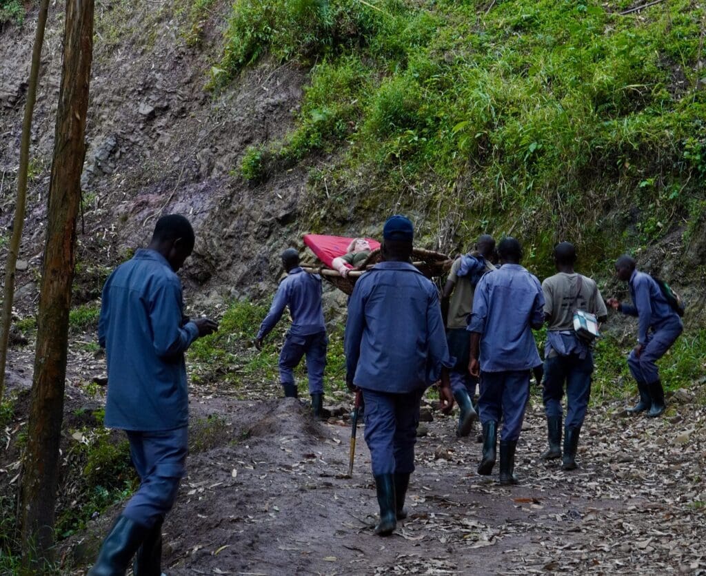 De trekking naar de gorilla’s is niet alleen een prachtige ervaring, maar ook een belangrijk programma dat bijdraagt aan hun bescherming. De inkomsten uit de permits worden gebruikt voor onderzoek, natuurbescherming en het ondersteunen van de lokale gemeenschap. En het werkt: de populatie berggorilla’s groeit! Met een voldaan gevoel keerden we terug naar de rest van de groep. Bij aankomst bleek dat de ‘African helicopter’—de noodhelikopter—al klaarstond, samen met dertien porters, om de ene dame terug te brengen. Na een snelle lunch volgde een pittige klim naar de parkeerplaats. Toen begon het te regenen. De lokale gidsen keken onrustig om zich heen: "We cannot be here when the rain comes! Then we have big problem to get back." Ze drongen erop aan om snel te vertrekken, want in de modder konden de wegen onbegaanbaar worden. Voor ons werd het extra spannend, want terwijl de andere toeristen een chauffeur hadden, moesten wij zelf rijden. Onze auto was stevig, maar de wegen waren smal, bezaaid met stenen en gaten, en direct naast ons gaapte een diepe afgrond. Eén ranger, gewapend met een enorm geweer, stapte bij ons in om ons te begeleiden. Op een steil stuk bergop viel de auto stil. Ondanks handrem én gewone rem gleden we langzaam achteruit. Stress bij chauffeur Meike! De ranger probeerde haar gerust te stellen: "Do not be afraid." Matthijs gaf haar een peptalk, en twee behulpzame porters legden snel stenen achter de voorbanden voor extra grip. Met de auto in four-wheel drive en met geknepen billen, kwamen we eindelijk boven. Wat een overwinning!