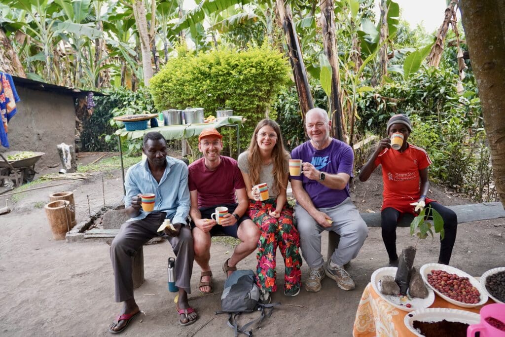 Na een lunch en een verfrissende wasbeurt – het stof zat óveral – besloten we om Willem te vergezellen op een koffietour. Dit begon met een wandeling door de heuvels, waarbij de hond van de gids ons enthousiast omver probeerde te lopen. "Zijn baas is nogal streng," legde de gids uit, "dus hij blijft het liefst zo dicht mogelijk bij de toeristen." Onze koffie-expert van de dag was Sunday Godfried, een lokale boer. Hij verwelkomde ons in zijn traditionele huis en nam ons vervolgens mee naar zijn plantage. Zijn eigen koffie was Robusta, maar onderweg liet hij ons ook Arabica-planten zien. We leerden over de volledige productie: twaalf handmatige stappen, van plukken en schillen tot zeven, drogen, roosteren en malen. Alleen het drogen had hij al gedaan, want dat proces duurt twee weken. Aan het eind proefden we ons eigen handgemaakte kopje koffie – geserveerd met een banaan, zoals de locals het doen. Heerlijk! We kochten een klein bakje met bonen en versgemalen koffie om mee naar huis te nemen. Matthijs had ondertussen een geanimeerd gesprek met Sunday’s 13-jarige zoon, en al snel bleek dat ze een gedeelde passie hadden: voetbal! Vooral de Engelse clubs met Nederlandse spelers oogstten bewondering. Een perfect einde van deze bijzondere ervaring.