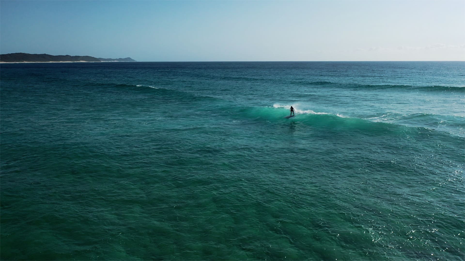 Een eenzame surfer berijdt een zachte golf op helder blauwgroen water, met de kustlijn en heuvels in de verte zichtbaar onder een heldere hemel.