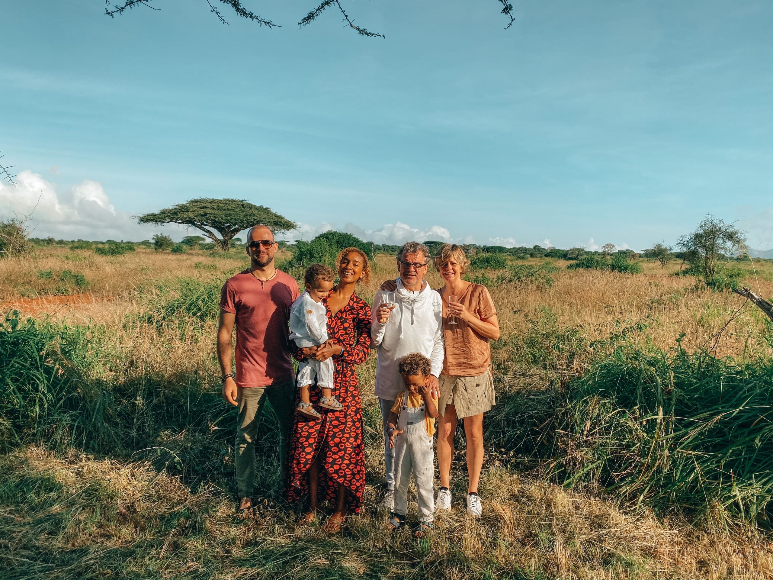 familie met jonge kinderen poseert in grasvlakte met wijnglazen in de hand tijdens safari in Kenia