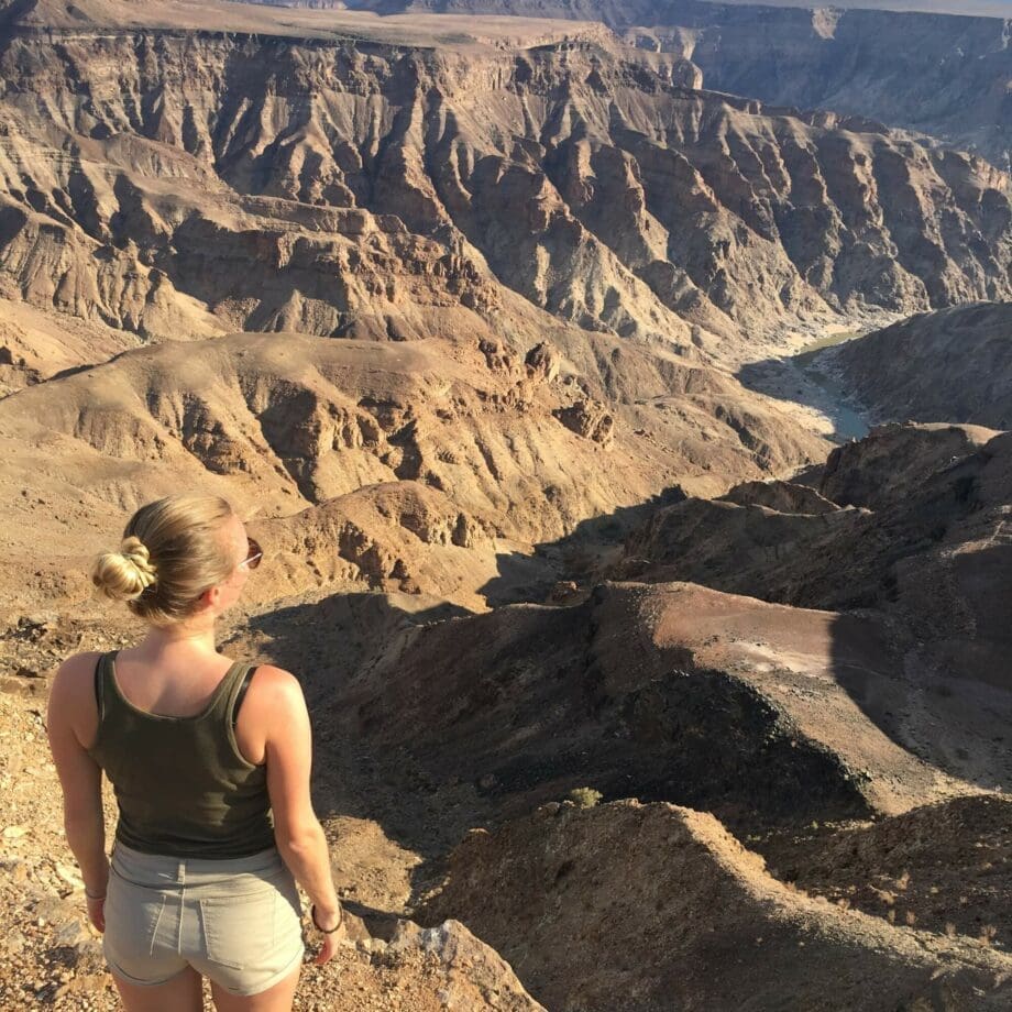 Auf gehts zum Fish River Canyon im tiefen Süden: „A million miles away from the rest of the world“. Der Fish River Canyon ist ohne Zweifel einer der spektakulärsten Orte Namibias. Die berühmte Schlucht ist die drittgrößte der Welt und misst über 160 Kilometer Länge, 27 Kilometer Breite und 550 Meter Tiefe. Von Mariental aus sind es etwa fünf bis sechs Stunden Fahrt. Fahrt früh los, damit ihr pünktlich zum Sonnenuntergang am View Point seid, denn dieses Schauspiel wollt ihr wirklich nicht verpassen. Wenn ihr sehr früh startet, habt ihr sogar die Möglichkeit, einen kurzen Abstecher zum Quiver Tree Forest in der Nähe von Keetmanshoop zu machen.
