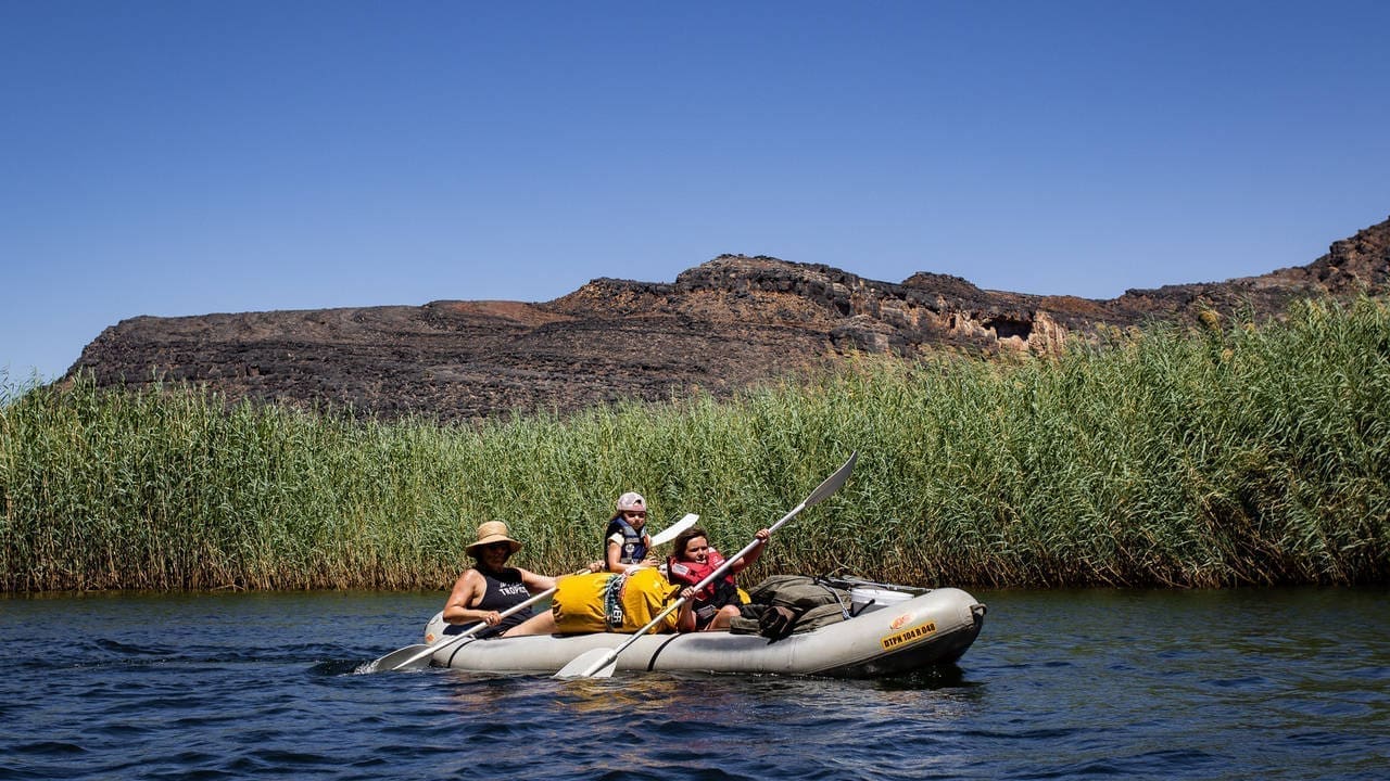 Hier geht ihr Kanu fahren und campt direkt am Orange River. Der endlos gewundene Fluss führt euch vorbei an verschiedensten Felsformationen. Mal treibt euch der Adrenalin Kick durch wilde Stromschnellen, mal gleitet ihr friedlich und entspannt über das glitzernde Wasser. Spannung und Abenteuer wechseln sich ab mit Ruhe und Weite in diesem unentdeckten und abgelegenen Stück Namibias. Am Nachmittag steigt ihr an den Ufern aus euren Kanus, baut das Camp auf und erlebt einen magischen Abend mit Lagerfeuer, leckerem Braai, kühlen Drinks, spannenden Geschichten und einem funkelnden Sternenhimmel.