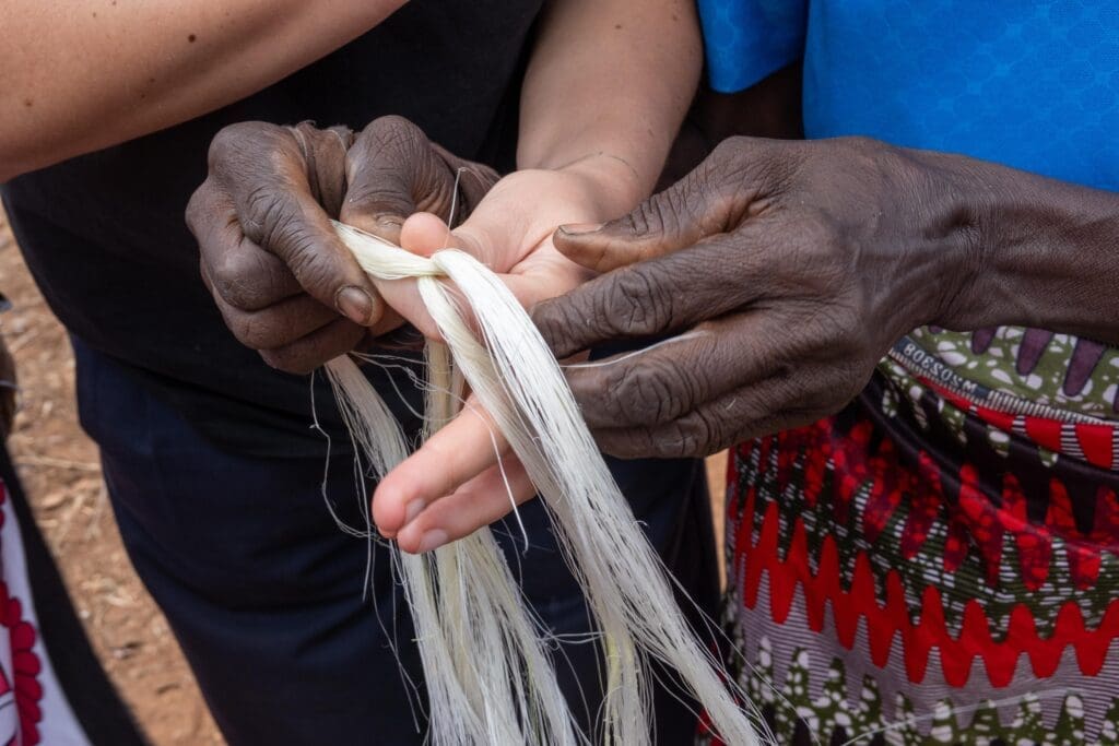 Die Gemeinschaft empfängt uns in wunderschönen, farbenfrohen Kleidern, sie singen und heißen uns voller Energie willkommen. Dies ist eindeutig kein touristisches, ausgetretenes Massai-Dorf, das spürt man sofort. Unser Besuch ist gut vorbereitet: Nach einer feierlichen Vorstellungsrunde steht ein abwechslungsreiches Programm bereit. Wir lernen, wie sie superstarke Sisalseile herstellen, pflanzen gemeinsam Bäumchen und tragen unseren Namen in ihr neues Gästebuch ein. Der Stolz dieser Menschen ist greifbar!