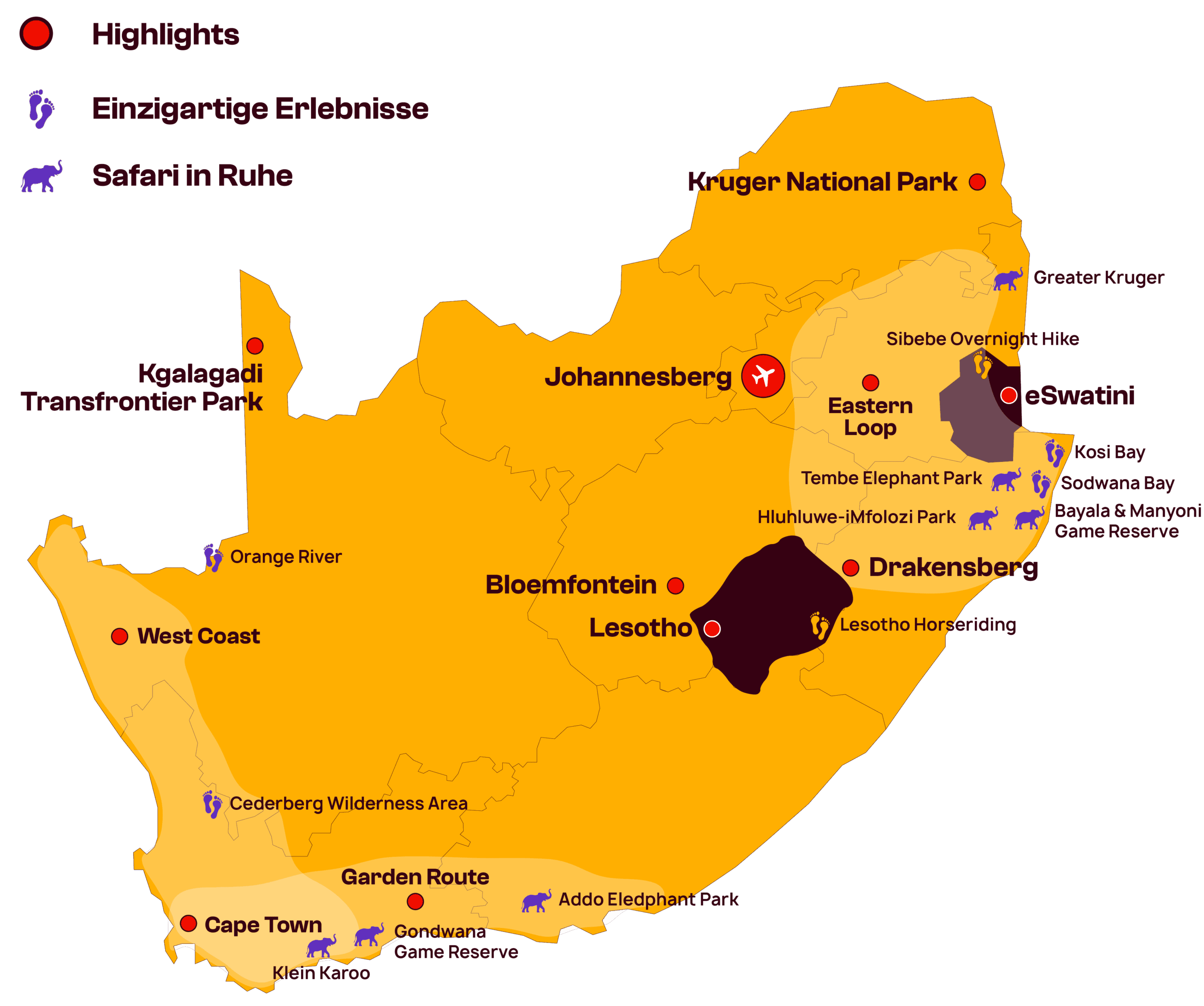 Südafrika ist ein Land, in dem du wirklich alles erleben kannst, von der berühmten Garden Route bis zur unberührten Westküste und unserer Favoriten Route: der Eastern Loop. Kombiniert mit reichen lokalen Kulturen, gastfreundlichen Menschen, Komfort und großartigem Essen hast du ein Land, das wirklich alles bietet.