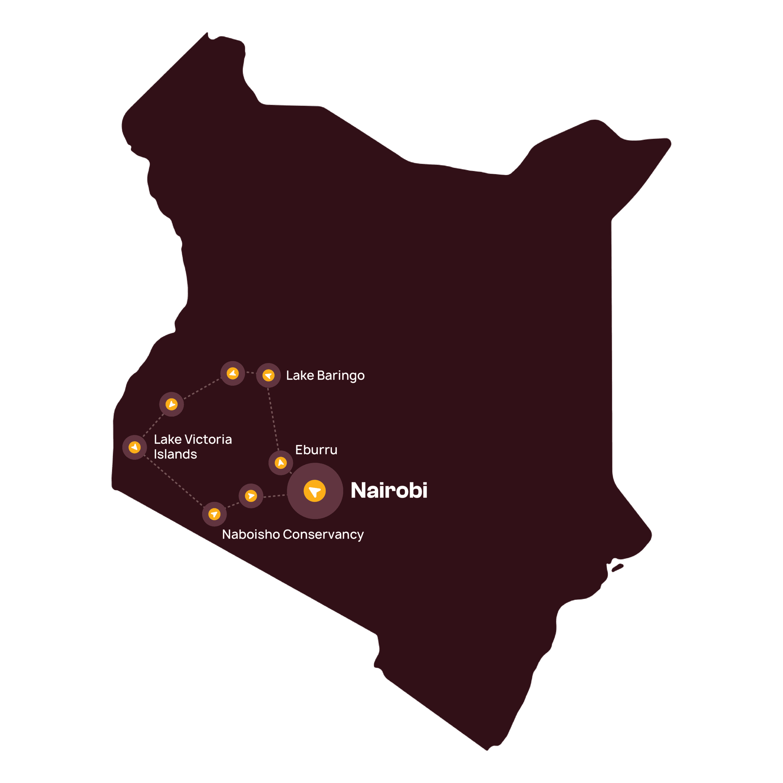 Nairobi, Eburru, Lake Baringo, Kerio Valley, Kakamega, Lake Victoria, Naboisho Conservancy, Narok