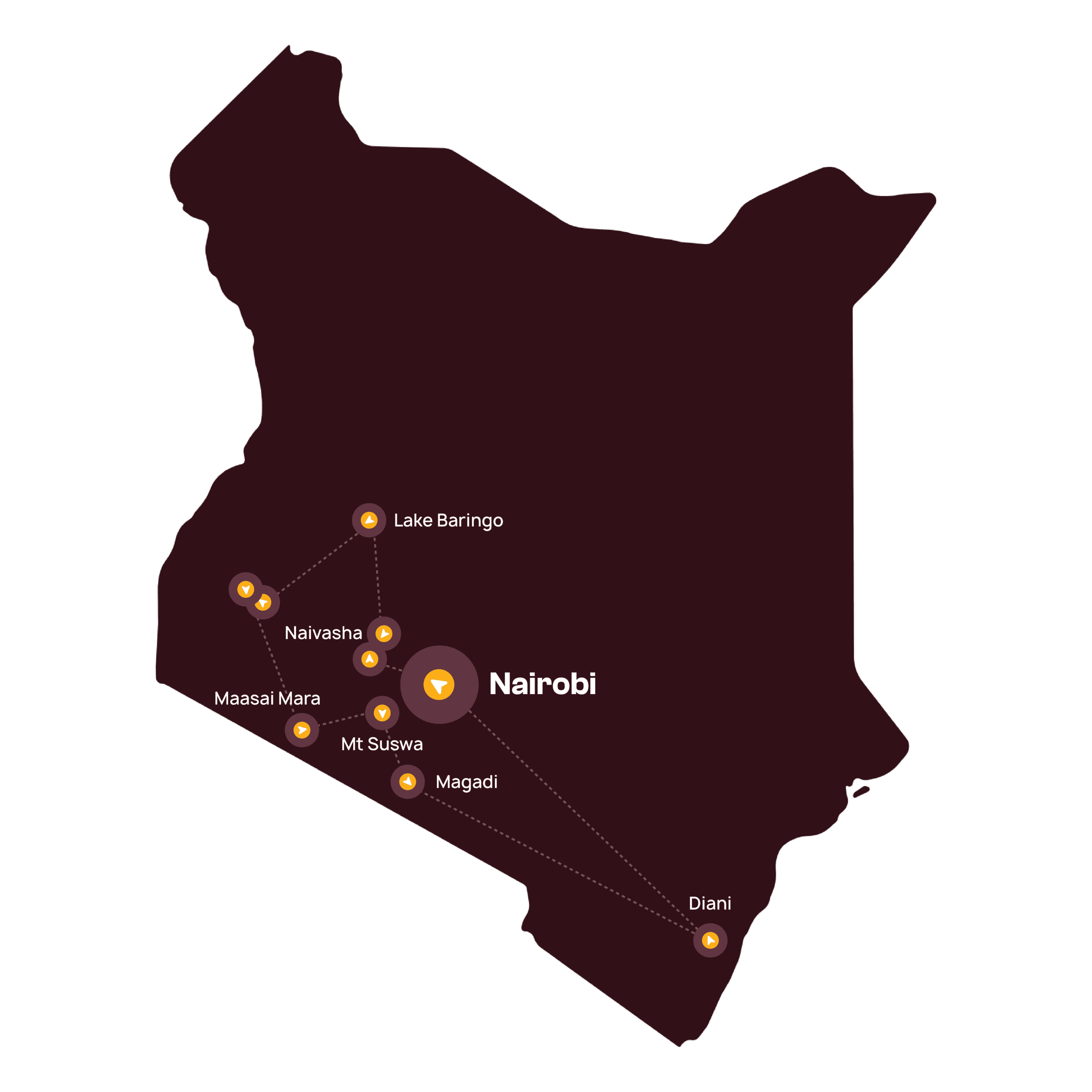 Nairobi, Naivasha, Lake Baringo, Kisumu, Mfangano, Rusinga, Maasai Mara, Suswa, Magadi, Diani