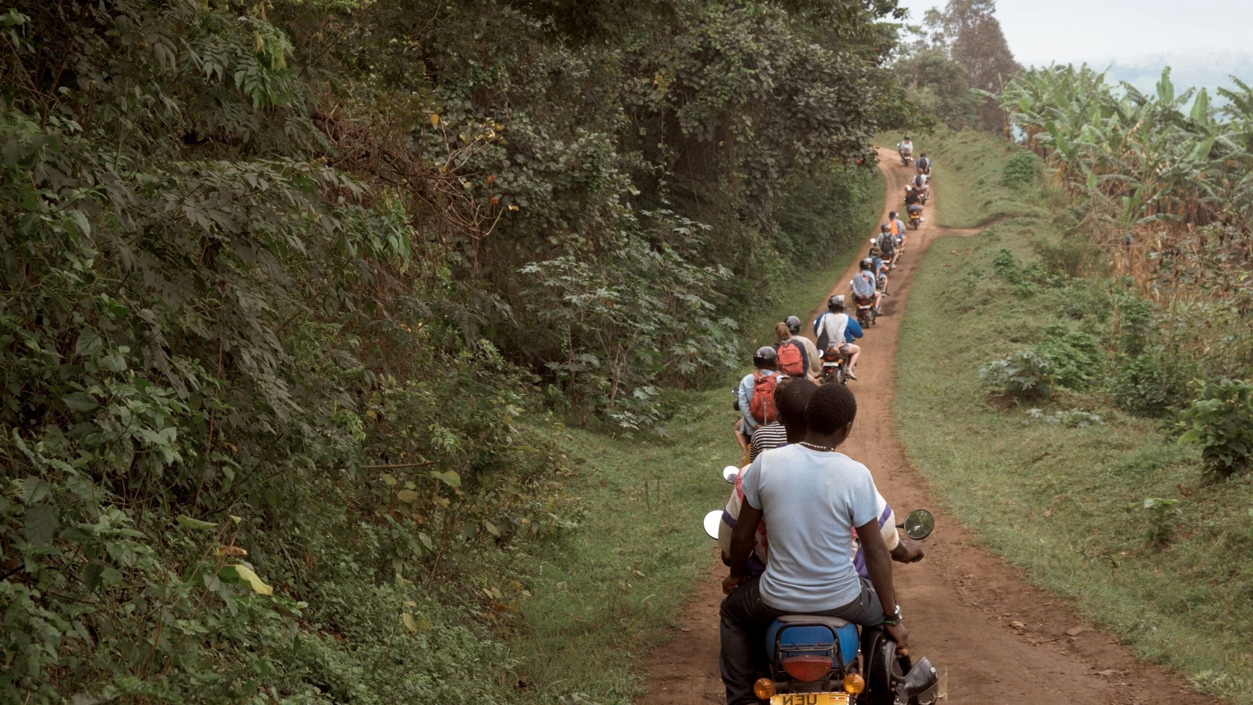 The trip lasts two days, and each day, you’ll ride through forests. You’ll travel along paths with 30-metre-high trees on the Rwanda border, or zoom through areas so densely forested that you can no longer feel the sun shining. Riding through the forest has almost a mystical quality.