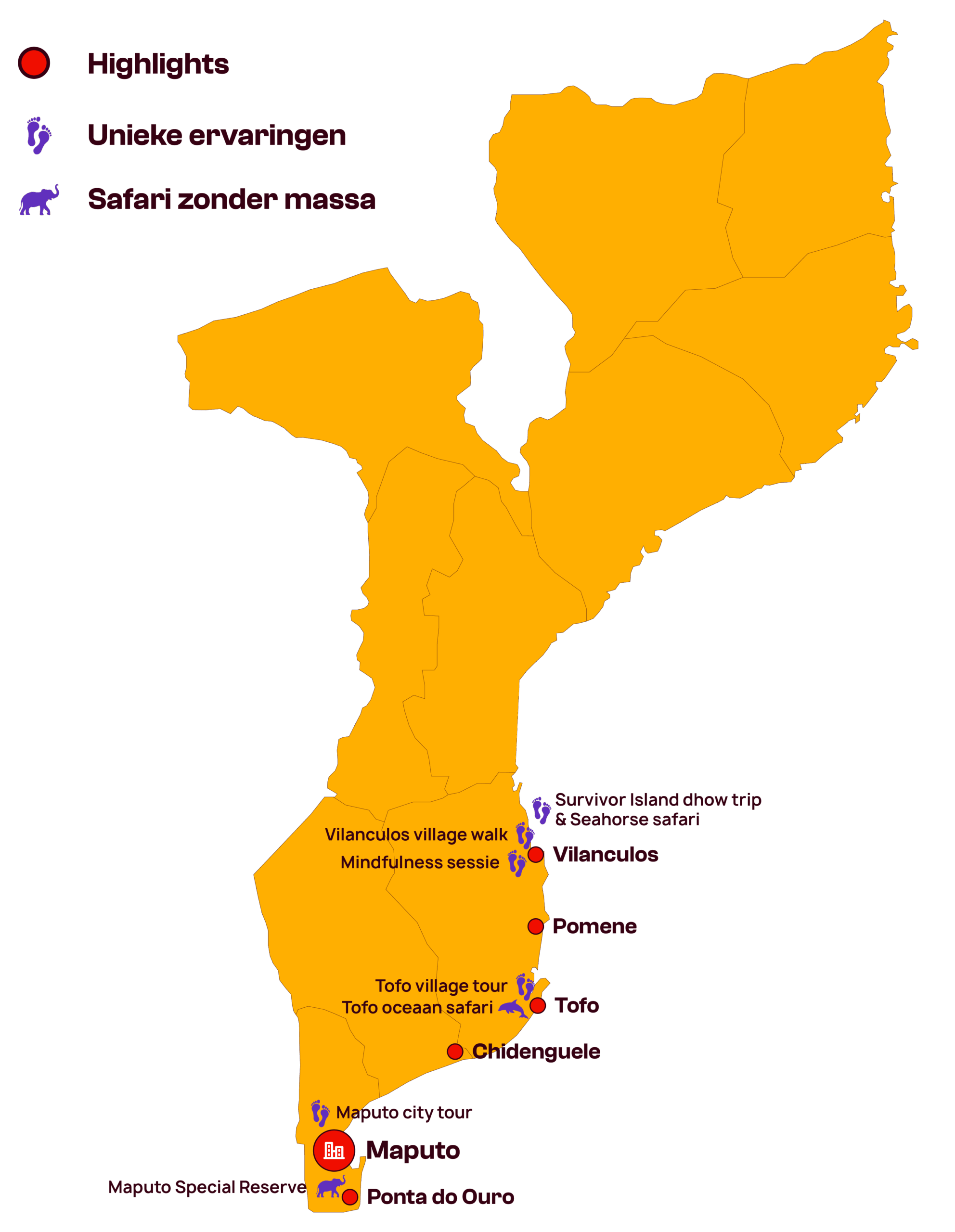 Denk aan eindeloze parelwitte stranden, een turquoise zee vol koraalriffen en kleurrijke vissen, en laidback kustdorpjes waar de tijd lijkt stil te staan. Maar Mozambique is meer dan alleen een tropisch paradijs. In bruisende steden als Maputo proef je de rijke mix van Afrikaanse, Portugese en Arabische invloeden in muziek, dans en architectuur, terwijl de keuken je verleidt met verse vis, pittige piri-piri en tropisch fruit. Voeg daar safari’s zonder drukte, een gastvrije bevolking en de vrijheid van off-the-beaten-track reizen aan toe, en je snapt waarom Mozambique zo onweerstaanbaar is. Of je nu komt voor cultuur, avontuur of ultieme ontspanning: hier ontdek je een ruig, kleurrijk en ongerept Afrika dat je nergens anders vindt.
