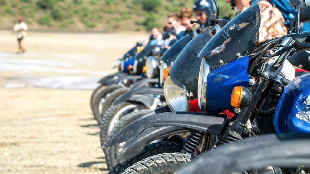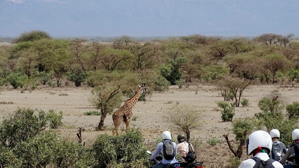 Nog vers in ons geheugen liggen de escapades van onze geitenslachters: ik-zag-dat-beest-echt-niet-hoor-motorgek en Goatface Killah die op brute wijze ons avondmaal heeft klaargemaakt. Even later zitten we weer op onze 150cc motoren en scheuren we weg uit het lokale Maasai dorpje. Onderhand voelen we ons als veteranen op onze stalen rossen (wat in werkelijk voor slechts een enkele geldt) en rijden we de savanne weer op. Waar we gisteren een aantal wildebeests in volle vaart met ons mee zagen sprinten, rennen er nu struisvogels voor ons uit over de vlakte. Het hoogtepunt wordt pas echt bereikt wanneer we met z’n elven in een losse V-formatie van grofweg 30 meter breed over de savanne cruisen: giraffen galopperen statig mee aan onze linkerhand en een groepje zebra’s rechts van ons.