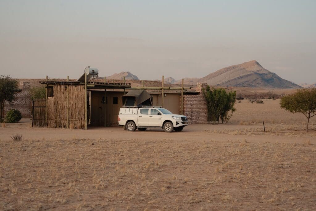 Zó, de voorbereidingen zijn uit de weg, nu kan het echte avontuur beginnen! We zijn onderweg met onze trouwe 4×4, compleet met daktent, klaar voor de uitgestrekte, ongetemde schoonheid van Namibië. De eerste overnachting? Glamping. Een perfecte kennismaking met de open hemel en de Afrikaanse wildernis. Een koud biertje, een paar keer lachen rond een vuurtje en we zitten er middenin.