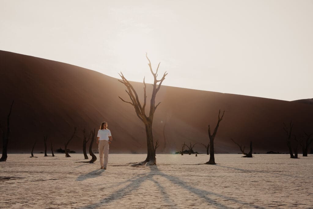 We stonden vroeg op – echt vroeg – en gingen op weg naar de Deadvlei. De ervaring is surrealistisch. De gebarsten witte klei onder de voeten, de spookachtige silhouetten van eeuwenoude bomen en de ochtendzon die overal gouden tinten overheen werpt – het is zoals we nog nooit hebben gezien. Ken je het gevoel dat iets zo mooi is dat je even moet pauzeren om alles in je op te nemen? Zo voelde het.