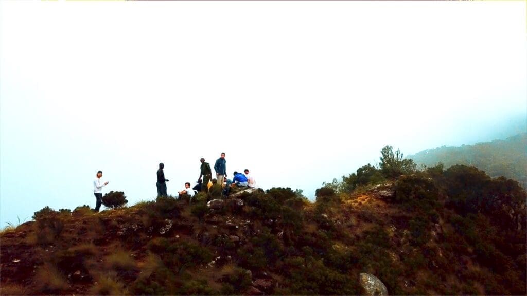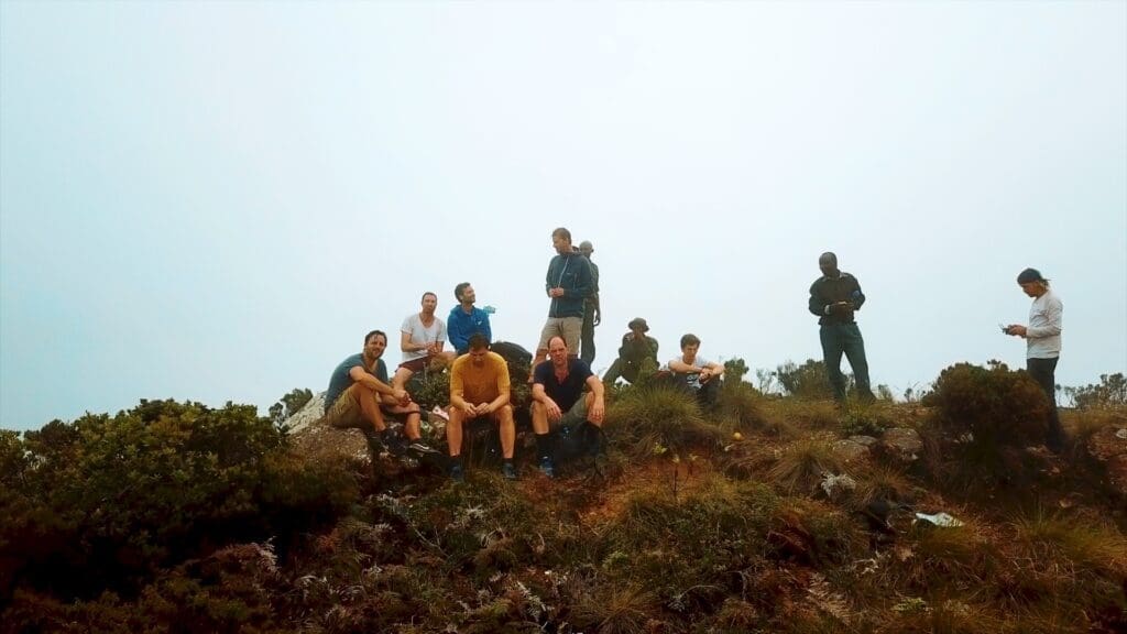 We klimmen over warm, stoffig rood zand, via rotsige paden, kruipen door dichte, lage begroeiing, op handen en voeten. Mooi uitzicht. En ineens lopen we op een zachte, mosachtige grond onder hoge bomen van het regenwoud, om ineens bovenop een smalle top te staan. We lunchen, voldaan, terwijl we door de gaten in de wolken met het zonlicht mee naar beneden kijken, naar Afrika. “Hebben we dat serieus net gedaan?!”