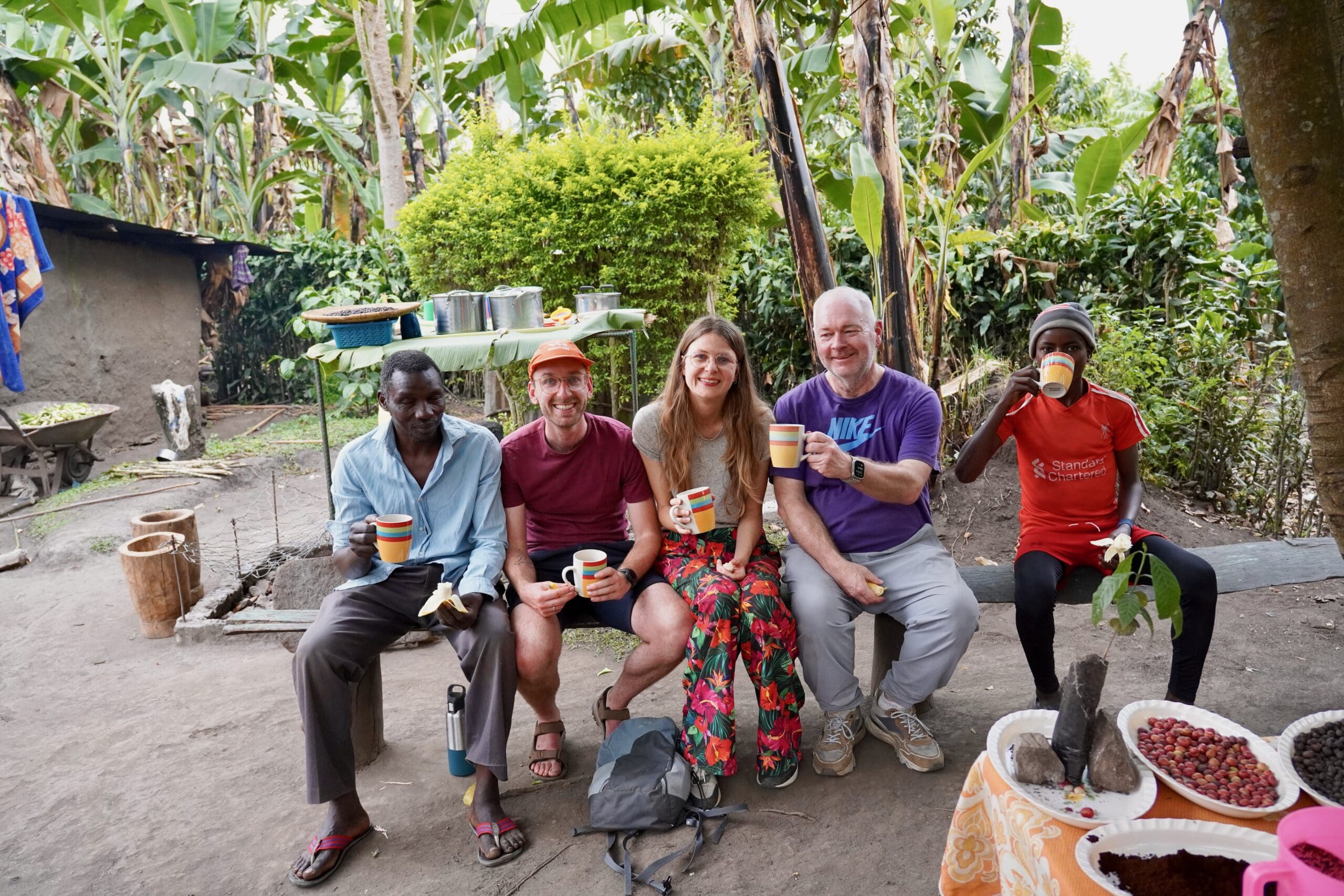 Bij zonsondergang in Oeganda verzamelen lokale stamleden in traditionele kleding en reizigers in vrijetijdskleding zich buiten, samen kletsend op de onverharde grond onder de uitgestrekte Afrika-hemel.