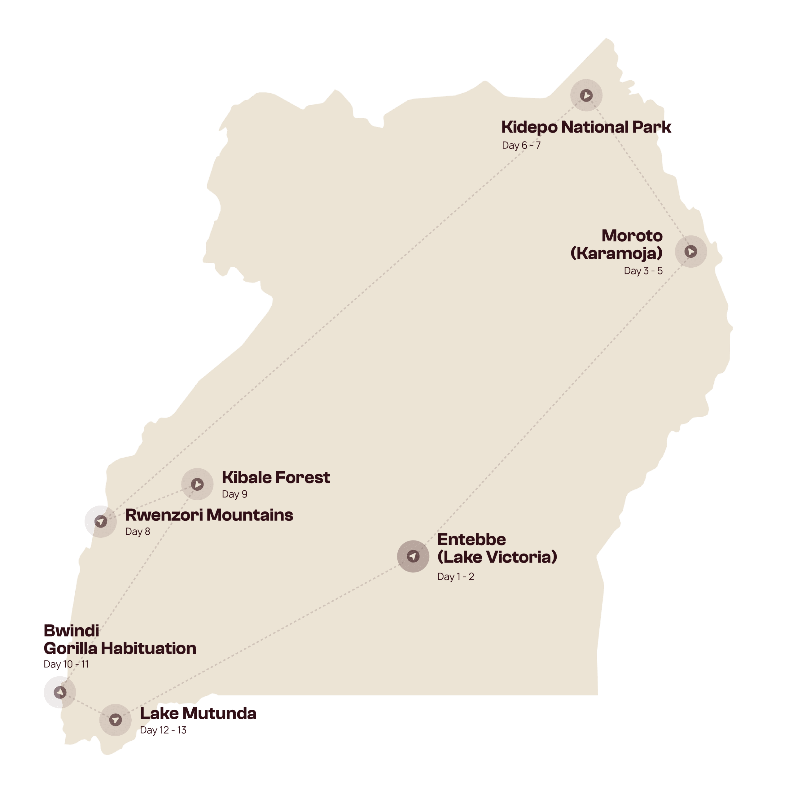 Nomadische homestay bij de Karamojong, Motorbike-expeditie door semi-woestijn, Scenic flight over de Rwenzori Mountains, Chimpanzee en Gorilla habituation.