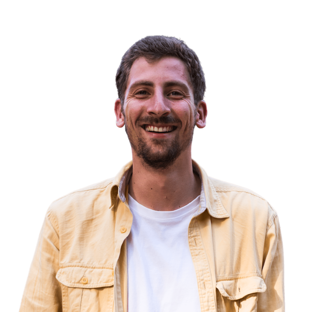 Een man met kort bruin haar en een baard glimlacht, draagt een lichtgeel overhemd over een wit t-shirt en staat tegen een effen witte achtergrond.